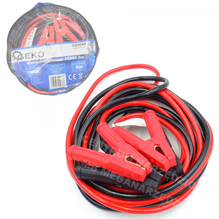 - GEKO G80048 przewody rozruchowe 1500A, 2x6 m — mocny start bez manewrowania. Elastyczna gumowa izolacja na mrozie, wzmocnione zaciski, maszynowo zaciskane połączenia. W zestawie etui. Do aut osobowych, dostawczych i rolniczych. EAN 5901477154737.