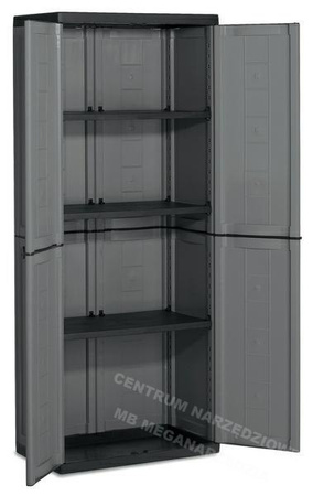 - Wysoka szafa KETER Jolly 166×68×39 cm – trwałe tworzywo, odporna na warunki atmosferyczne. 3 wyjmowane, regulowane półki (udźwig 15 kg), możliwość kłódki. Do garażu, warsztatu i biura.