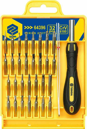 - Zestaw wkrętaków precyzyjnych VOREL 32 szt. (model 64396) wykonanych ze stali chromowo-wanadowej (CrV) z wymiennymi końcówkami. Idealny do precyzyjnych prac serwisowych, takich jak naprawy elektroniki, zegarków, okularów i innych delikatnych urządzeń.
