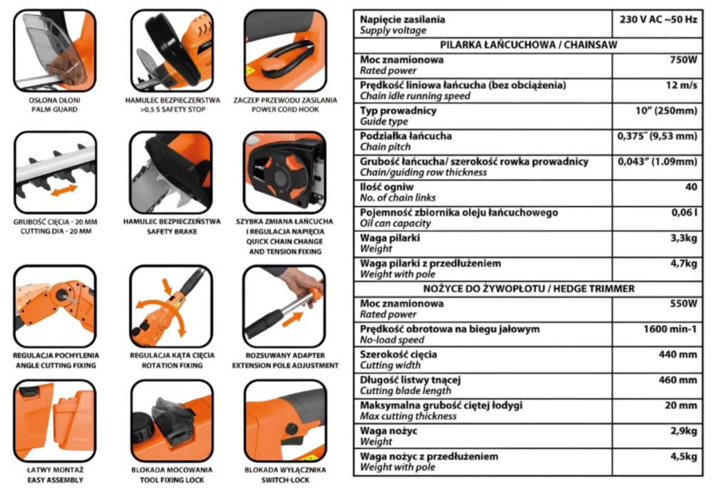 - NEO TOOLS 04-634 to wszechstronne urządzenie ogrodowe 2w1: pilarka na wysięgniku (750 W, prowadnica 25 cm, 12 m/s) i nożyce do żywopłotu (550 W, listwa 46 cm, Ø cięcia 20 mm).